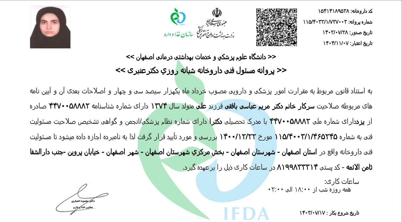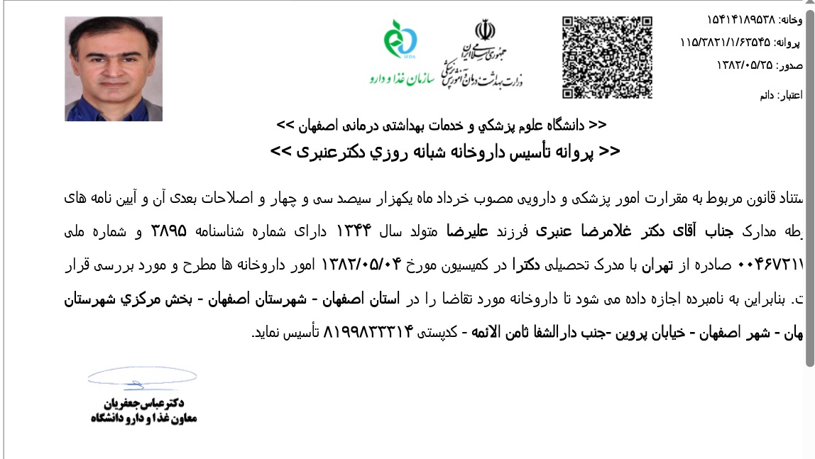 دکتر غلامرضا عنبری، داروساز حرفهای (Pharm.D) در شهر اصفهان با شماره نظام پزشکی د-8371، بنیانگذار این مجموعه تخصصی است.
