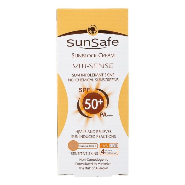 کرم ضد آفتاب spf50 فاقد جاذبهای شیمیایی بژطبیعی سان سیف حجم 50 گرم